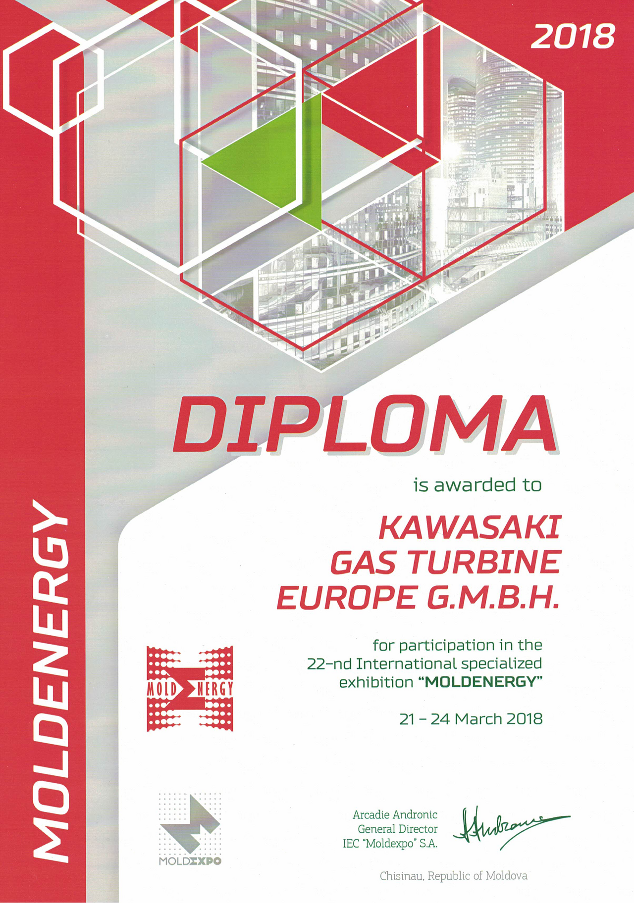 Diploma for the participation at MOLDENERGY 2018 received from MOLDEXPO